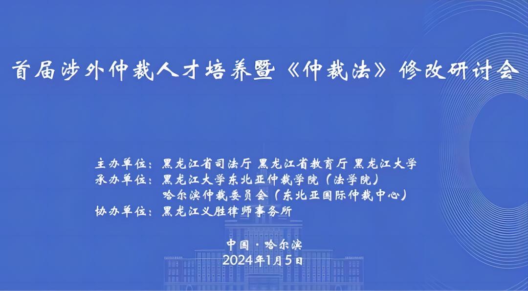 2024年1月5日,由黑龙江省司法厅、黑龙江省教育厅、黑龙江大学主办,黑龙江大学东北亚仲裁学院、哈尔滨仲裁委员会承办的首届涉外仲裁人才培养暨《仲裁法》修改研讨会在哈尔滨召开。开幕式由黑龙江大学法学院院长哈书菊主持,司法部公共法律服务管理局二级巡视员石海,黑龙江省司法厅党委委员、副厅长刘勇,黑龙江省教育厅党组成员、副厅长程爽,黑龙江大学党委常委、副校长于文秀出席开幕式并致辞。哈尔滨市委常委、政法委书记、哈尔滨仲裁委员会主任梁野出席开幕式。闭幕式由哈尔滨仲裁委员会专职副主任王雨轮主持,司法部公共法律服务管理局二级巡视员石海,黑龙江大学校长、党委副书记王敬波讲话。来自国内24所高校、36家仲裁机构和多家法律服务机构的代表130余人参加了此次会议。